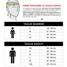 Per scegliere la taglia corretta munirsi di un metro flessibile e misurare la circonferenza della testa facendolo passare appena sopra le sopracciglia ed 1 cm sopra le orecchie. Confrontare poi la misura ottenuta con quelle riportate in basso e scegliere la taglia che più vi si avvicina partendo dalla più piccola. L'indicazioni in centimetri riportata affianco alla taglia è indicativa.